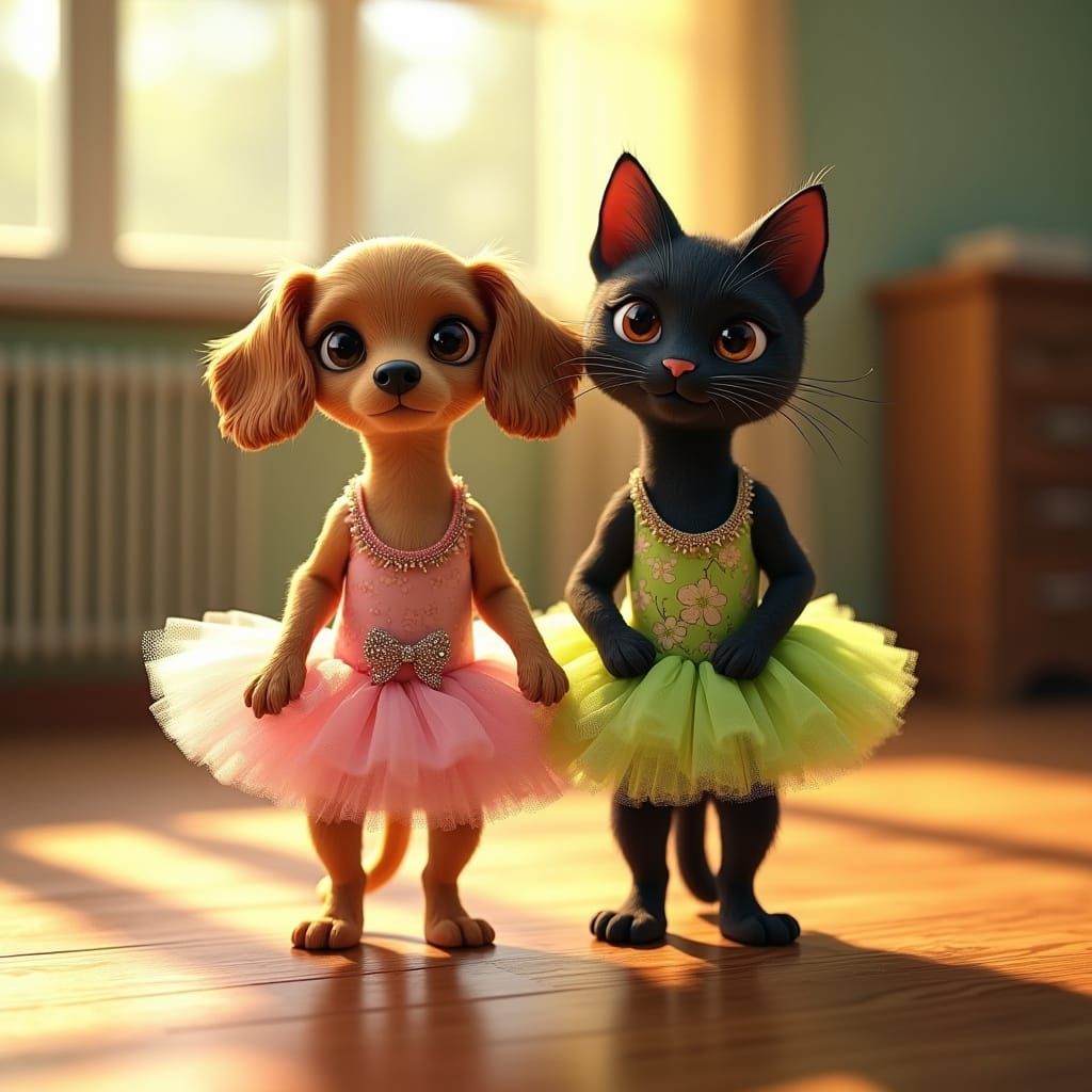 A charming portrait of a dachshund and cat in tutus, posing in a dance studio. The lighting and textures evoke a blend of Art Nouveau elegance and modern digital art.
