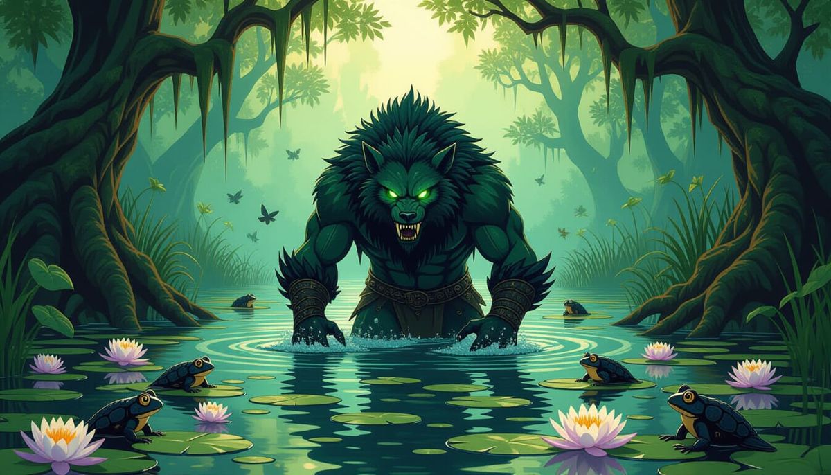 This image shows a monstrous faery-werebeast wading through a mystical swamp channel, surrounded by mutant creatures and flora. The art style blends dark fantasy with expressive lines and whimsical nature in a triadic color scheme.