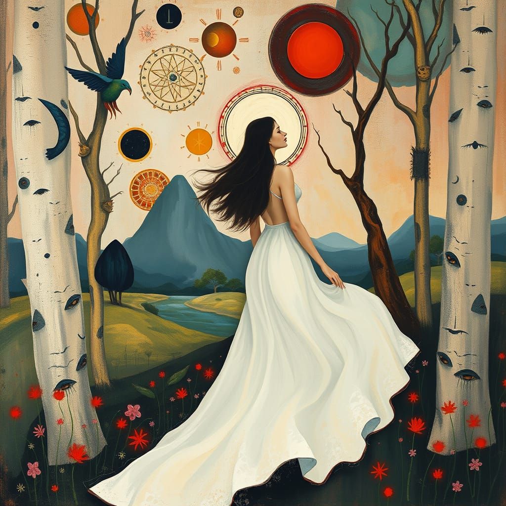 This image shows a mystical and poetic scene of a woman in a dreamlike forest, surrounded by bold brushstrokes and expressive textures, reminiscent of the styles of Paul Klee and Odilon Redon.