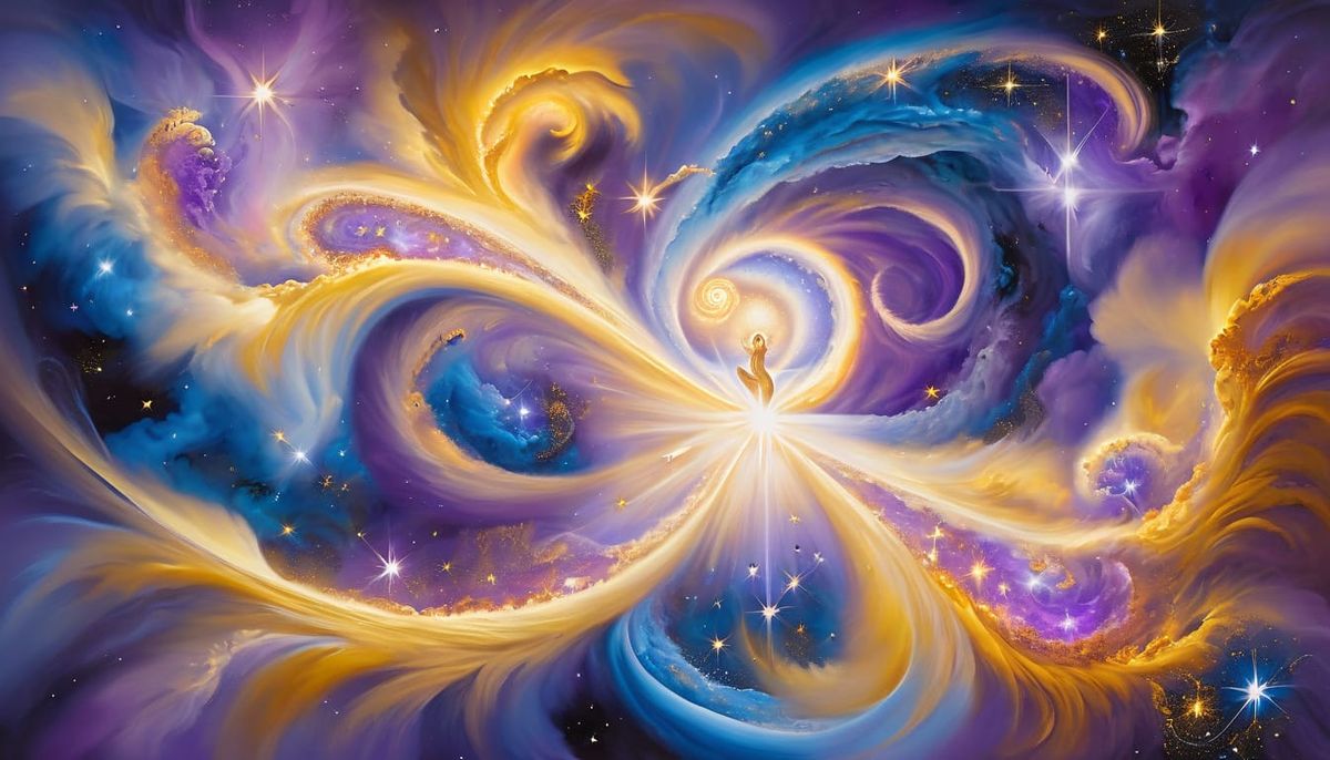 A surreal cosmic scene depicting the birth of a star. A radiant explosion of light takes the form of a maternal presence — flowing, luminous, and ethereal — as if the star is being cradled into existence by its own creator. Nebula clouds swirl in vibrant colors of gold, violet, and deep blue, while cosmic ...