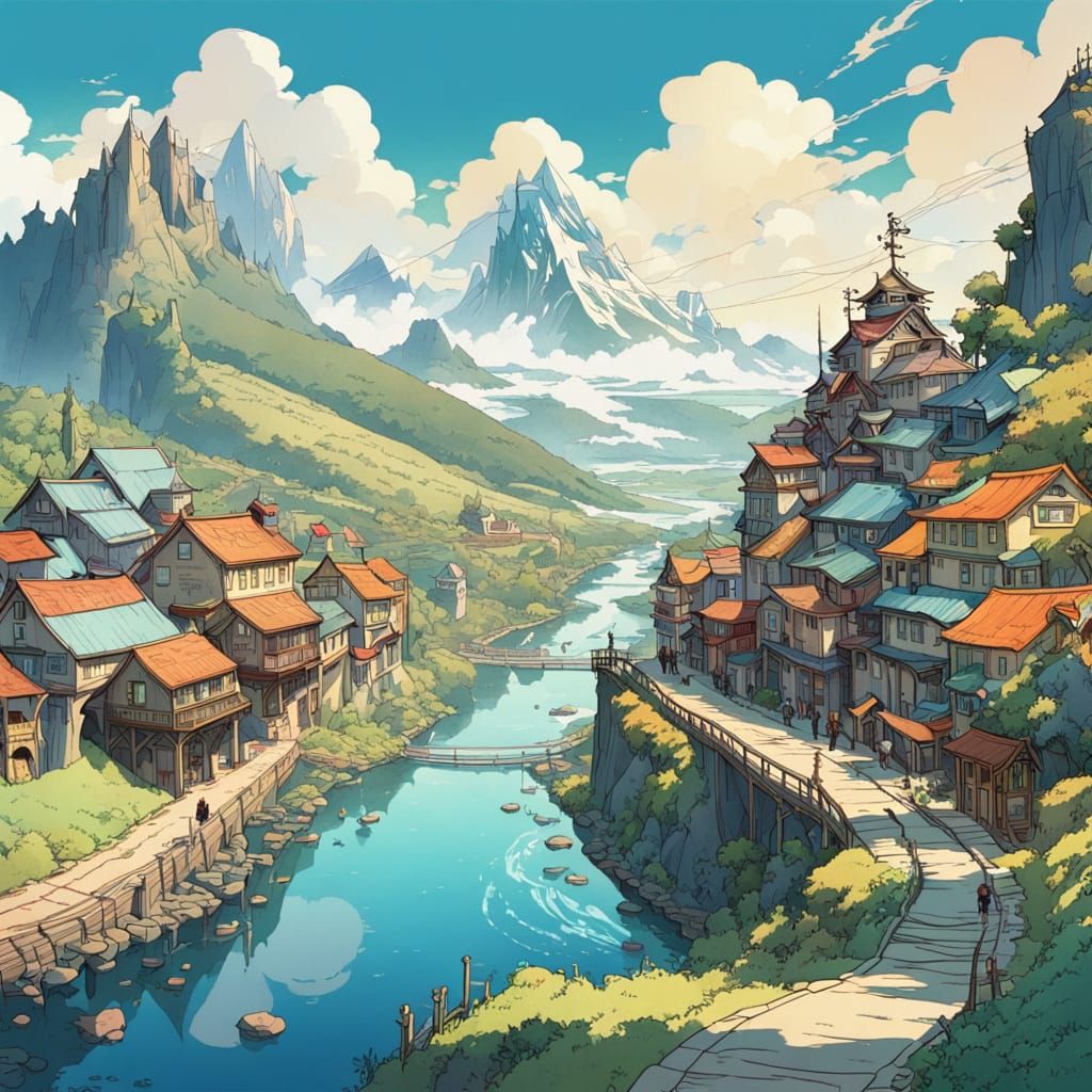 This image shows a charming town where the river meets the mountain and the sea, with colorful cartoon signs at the crossroads, inspired by the beautiful art of Alphonse Mucha and anime.