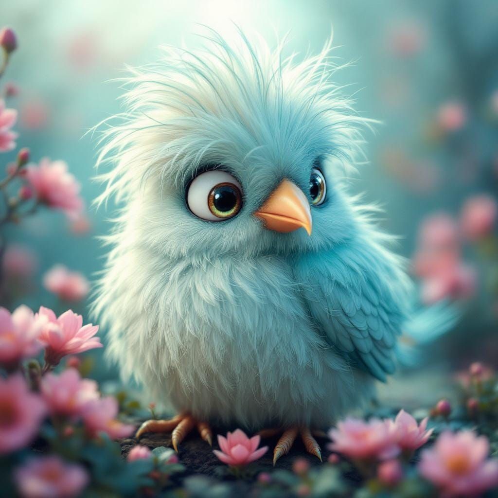 This image shows a charming, fluffy turquoise bird with tousled plumage and bright eyes, amidst a scattering of pink flowers. The artwork is reminiscent of fantastical digital matte paintings with rich, complementary colors.