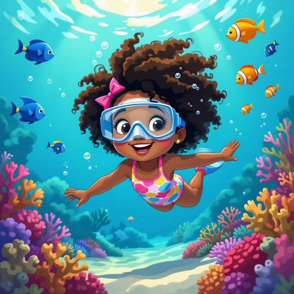 A charming animation cel of a Black girl snorkeling in a coral reef. She wears a colorful swimsuit while exploring the vibrant underwater ecosystem with wonder. Rendered in a stylized, cartoon aesthetic.