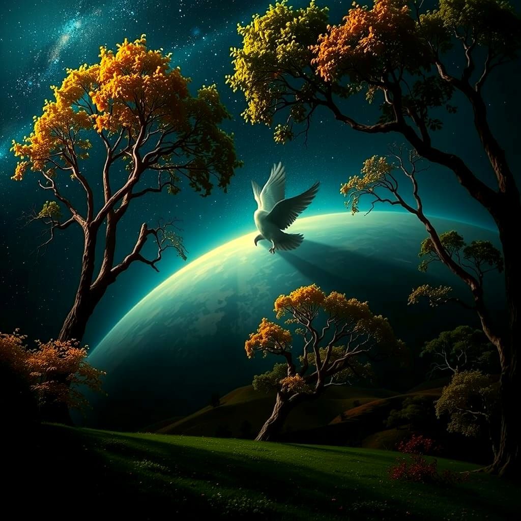 This image depicts a vibrant landscape with a lustrous blue sky, green fields, and deep red distant lands. Trees with golden leaves shimmer under a bright white light, evoking an autumn scene.