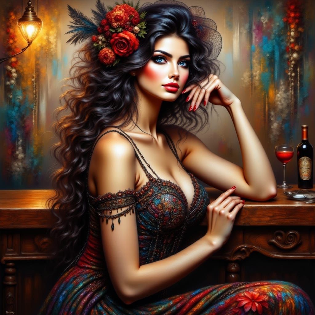 A hyperrealistic image of a woman in a 1920s dress, featuring dark hair, blue eyes, red lips, and long red nails. The splash art style emphasizes intricate details and dramatic lighting.