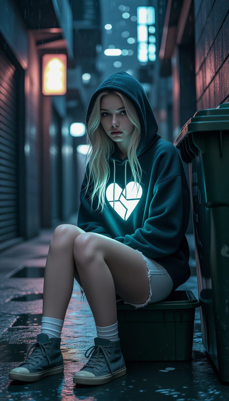 This image shows a teen with pale skin and flaxen hair huddled in a dark, futuristic alleyway. The scene features a worn hoodie with a broken heart logo, captured in dramatic, desaturated cinematic photography.