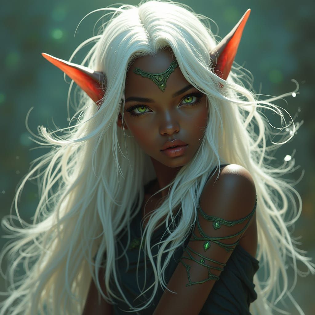 A striking picture of a dark-skinned elf with white hair and green eyes. The character is depicted in a painterly style with rich color depth and dynamic textures.