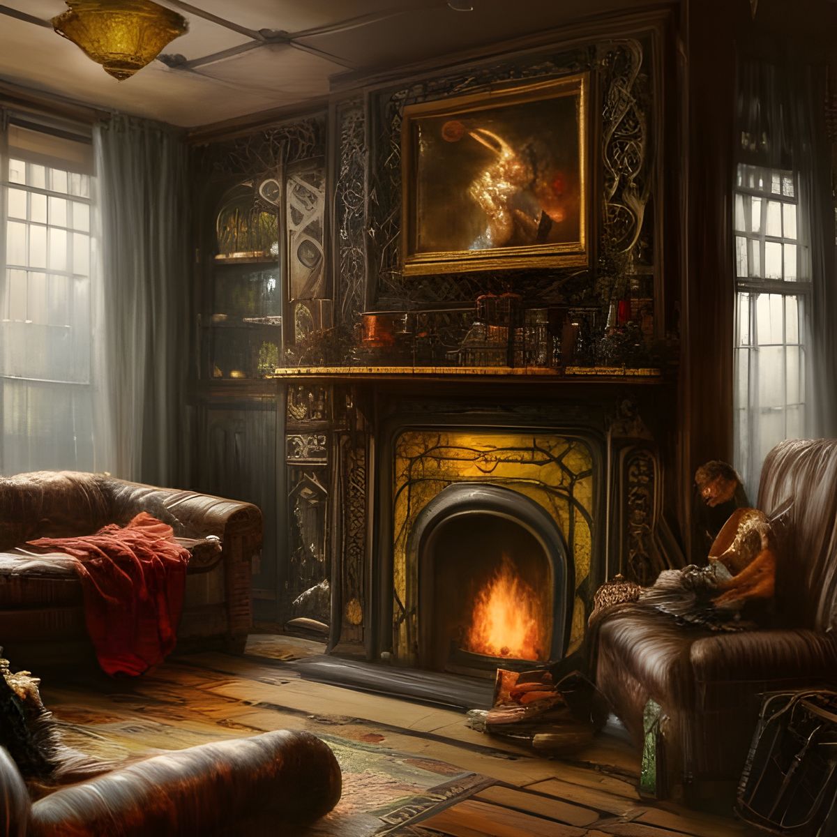 A hyperdetailed oil painting showcasing the interior of a cozy cottage fireplace in a city-punk aesthetic. Volumetric lighting and swirling ornamentals accentuate the inviting scene as concept art.