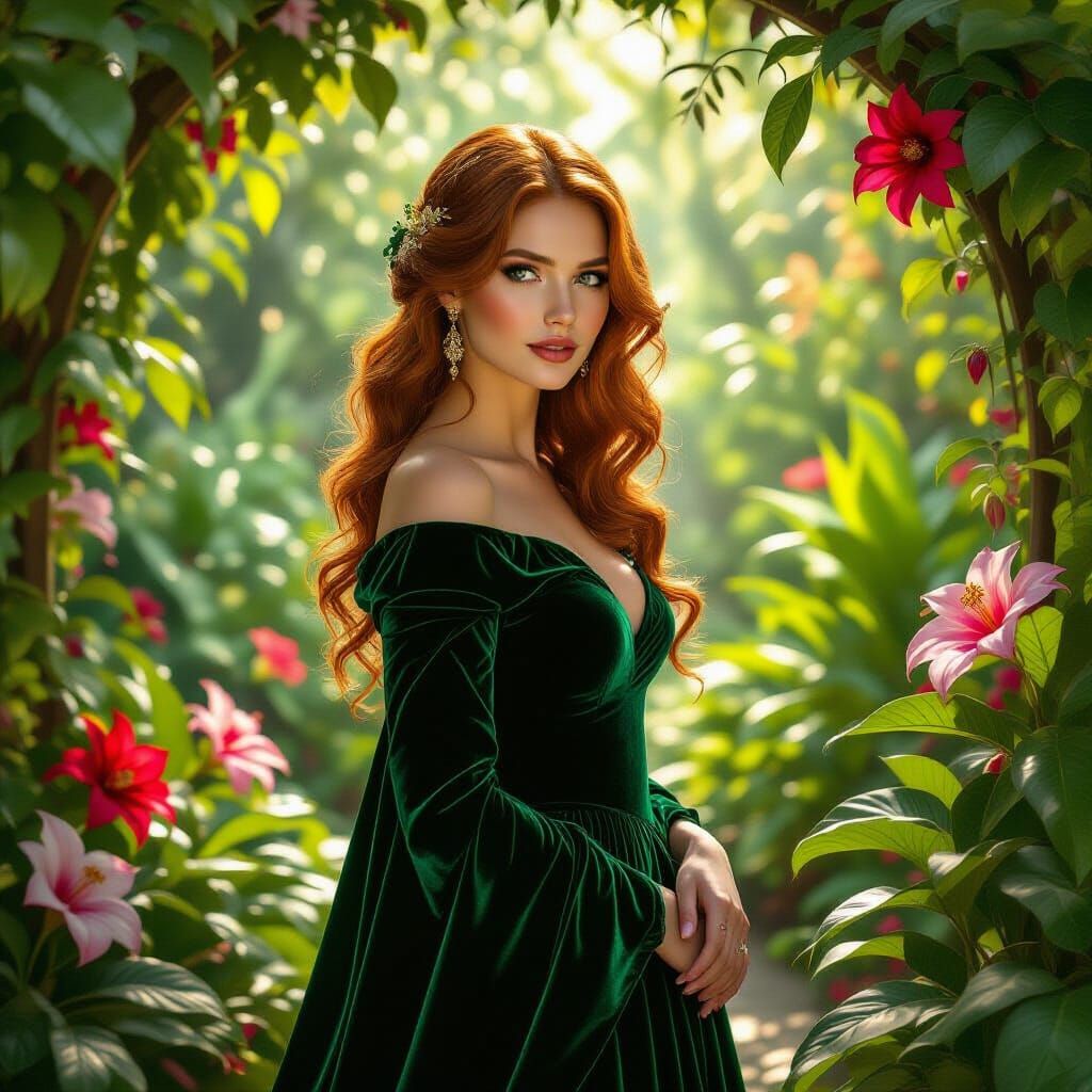 A beautiful woman with auburn hair in a green velvet dress in a vibrant garden. Sunlight creates dappled shadows. Rendered in a detailed, romantic style with rich colors and an ethereal glow.