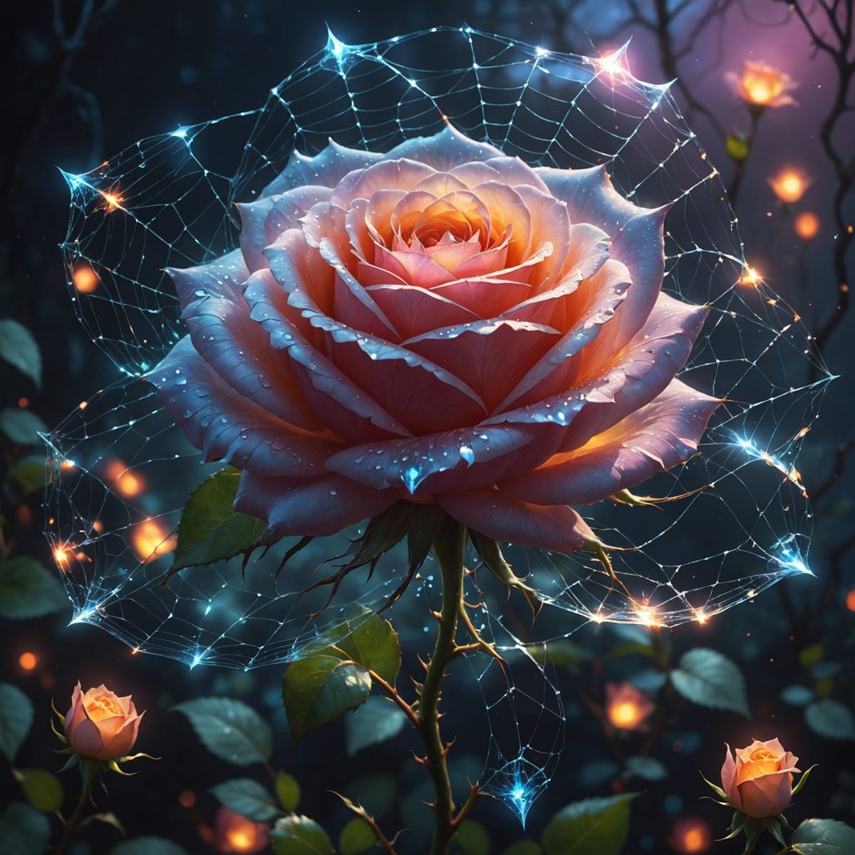This image shows a luminous rose crafted from light and spiderwebs, with star-like dewdrops. It floats in darkness, representing transcendent beauty in a fantasy art style.