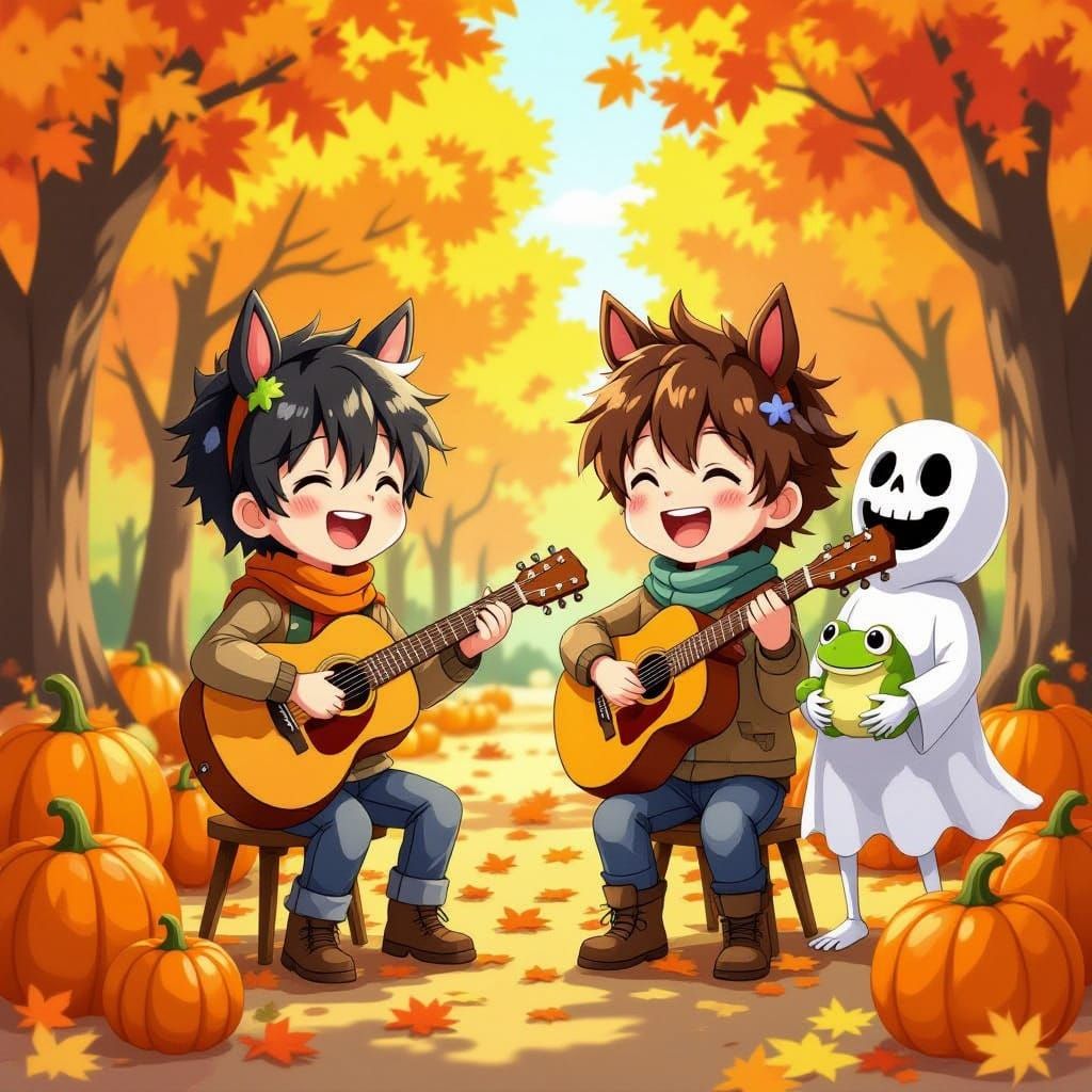 This vibrant anime wallpaper showcases two young men with horse ears laughing in an autumn park. A skeleton with a frog and pumpkins add to the cheerful scene, rendered in a cel-shaded style.