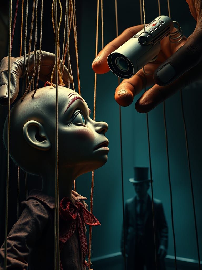 This image shows a marionette puppet looking up at the puppeteer's hands with anguish. In the style of surreal matte painting, the scene is richly textured with HDR lighting and high-contrast light.