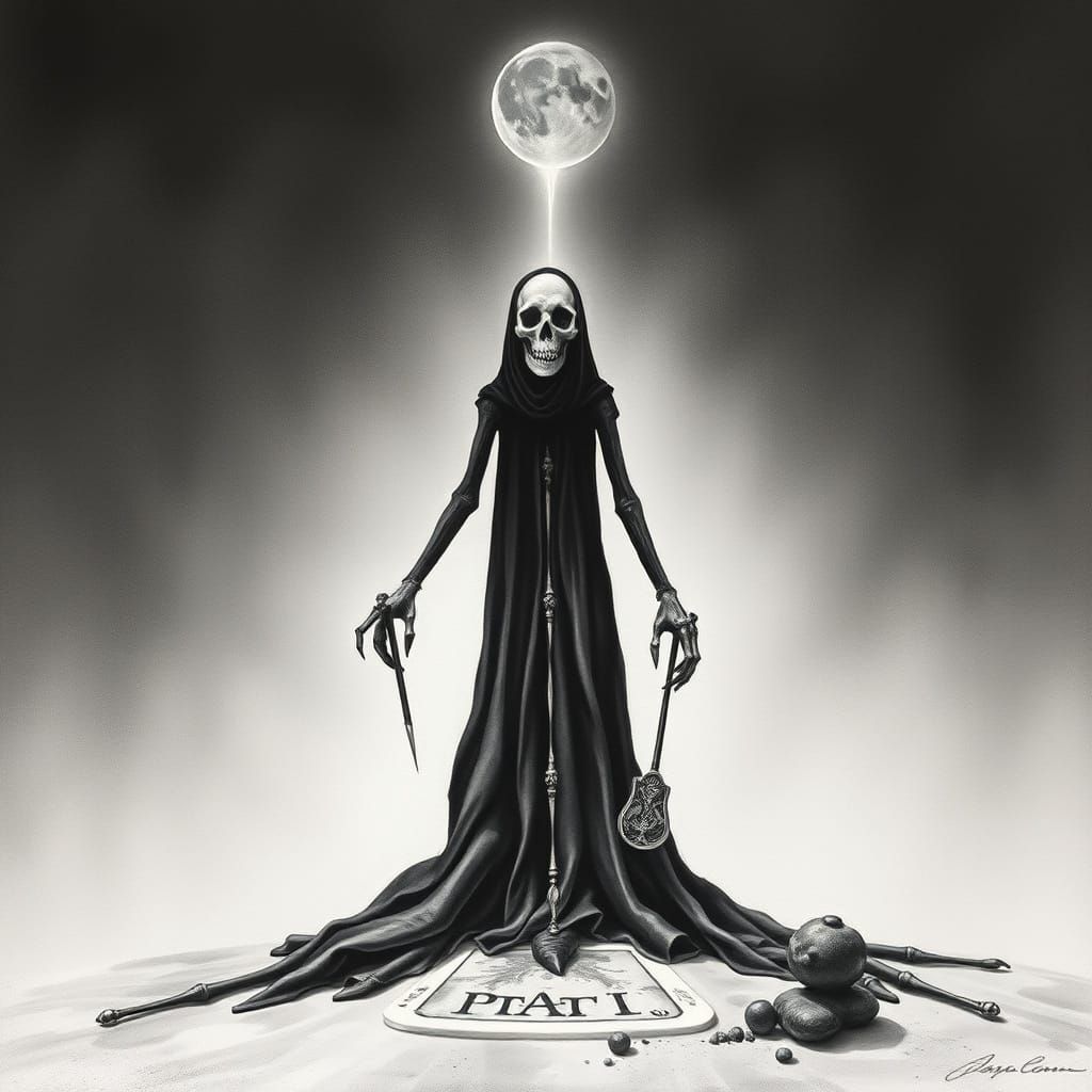 This image shows a surreal tarot card of Death in a pastel, monochrome watercolor style. It features elements reminiscent of melting oil on canvas and a matte background, in a surrealist style.