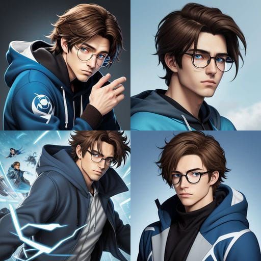 This image shows a teenage superhero in a blue and grey suit, sporting an open hoodie and round glasses. The character embodies a comic book aesthetic.