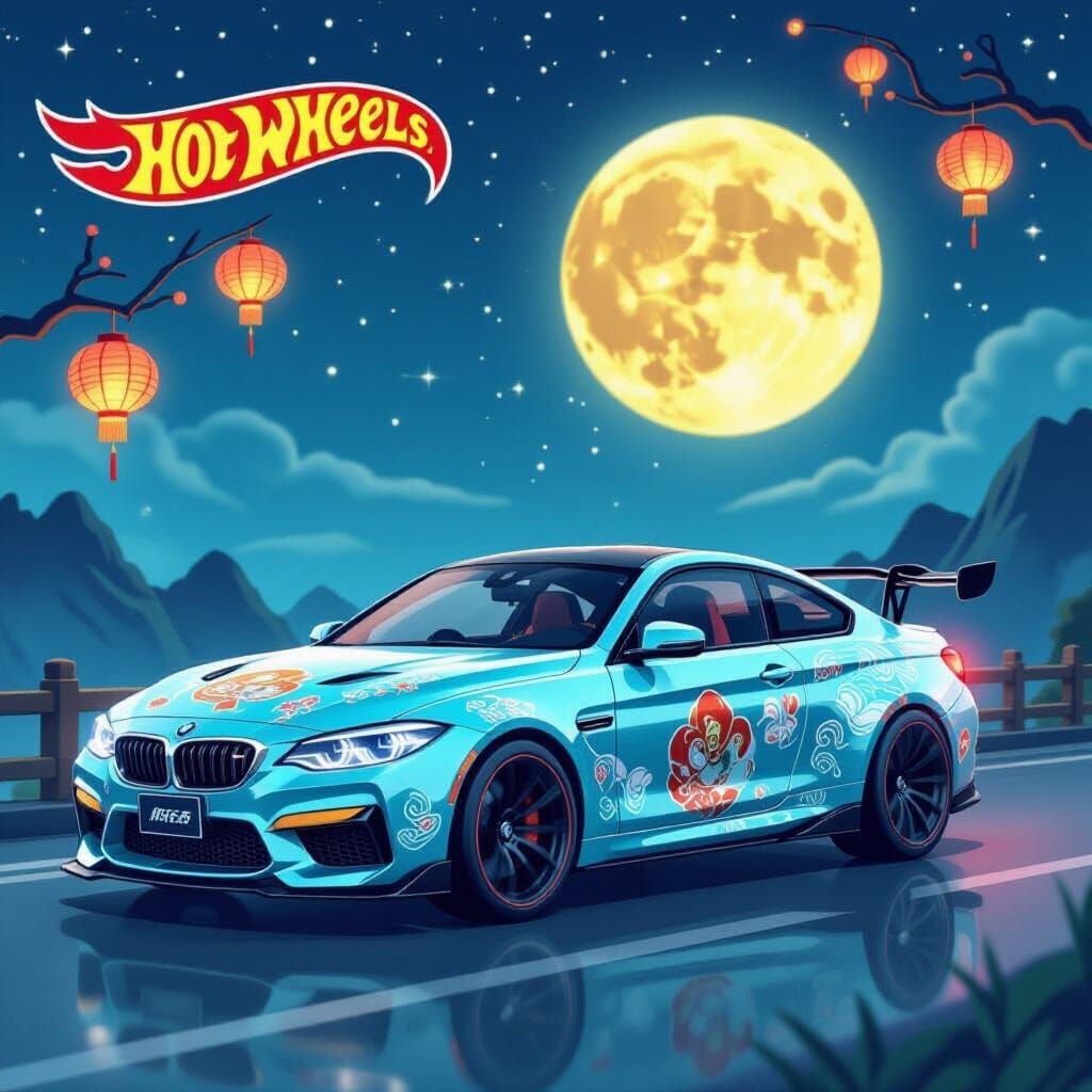 A Hot Wheels car featuring a vibrant Chinese Mid-Autumn Festival design, complete with a glowing moon and lanterns, presented in a modern graphic art style.