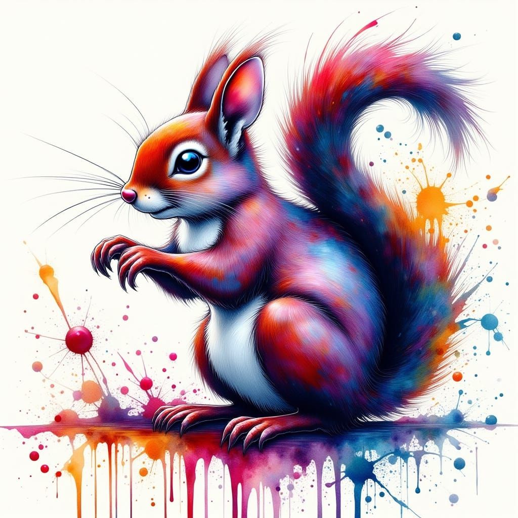 A vibrant oil painting of a squirrel and bird, rendered with ink splatter effects. This high-contrast artwork features ultra fine detail, dramatic lighting, and deep colors.