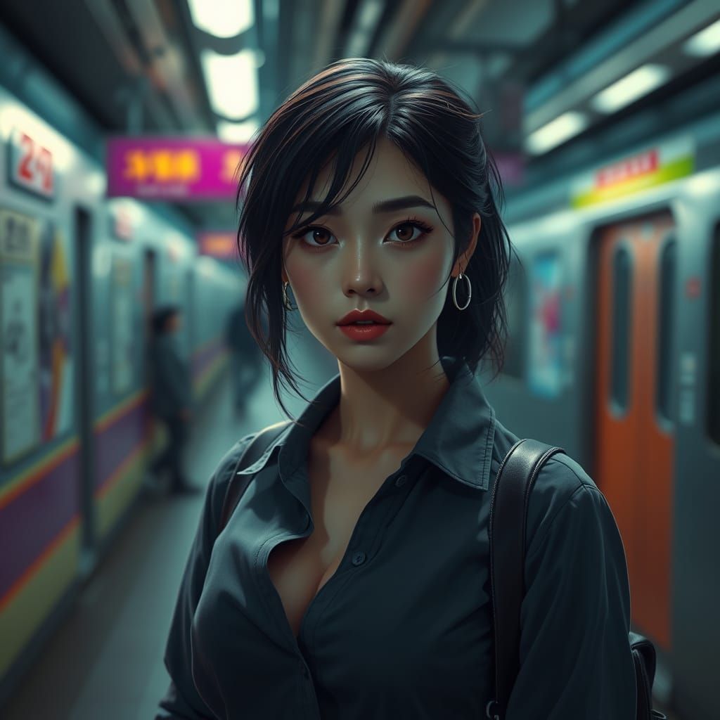 A hyperrealistic, detailed image of a lonely Japanese businesswoman on a subway platform, created in a dark fantasy concept art style with dramatic lighting and complementary colors.