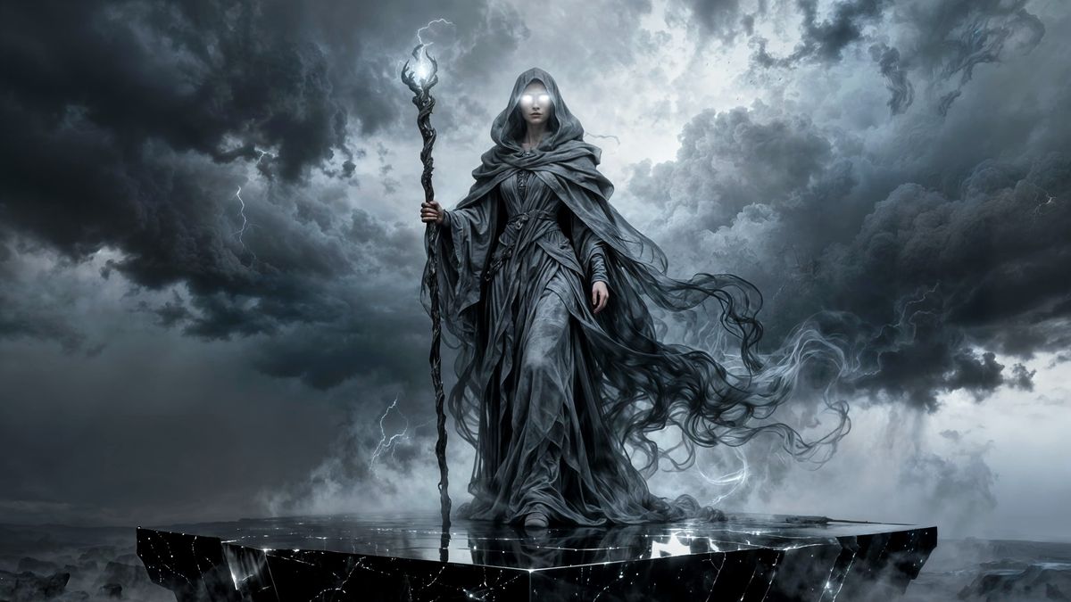 A haunting portrait of a powerful sorceress cloaked in grays on an obsidian plateau. Her glowing eyes and staff are the only light against a storm-torn, colorless sky. Rendered with dramatic, detailed chiaroscuro lighting.