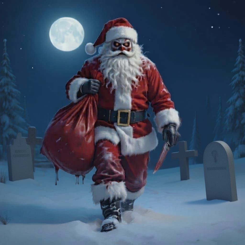 Zombie Santa Claus with bloody knife in hand and sack over shoulder, dirty sack is stained with blood and is dripping blood