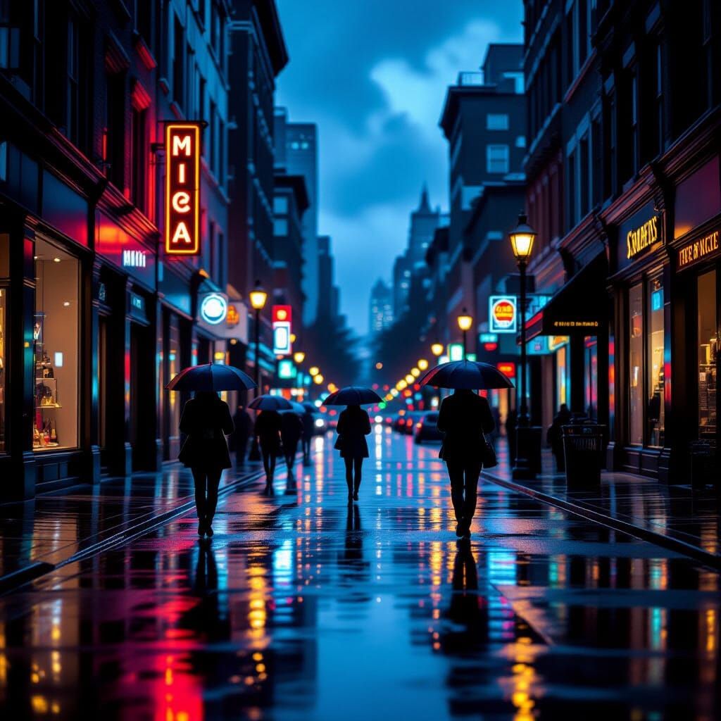 This image captures a cinematic urban street after rain, with wet asphalt reflecting vibrant neon lights and glowing lamps. People with umbrellas navigate the glistening scene, creating a nostalgic and immersive atmosphere.