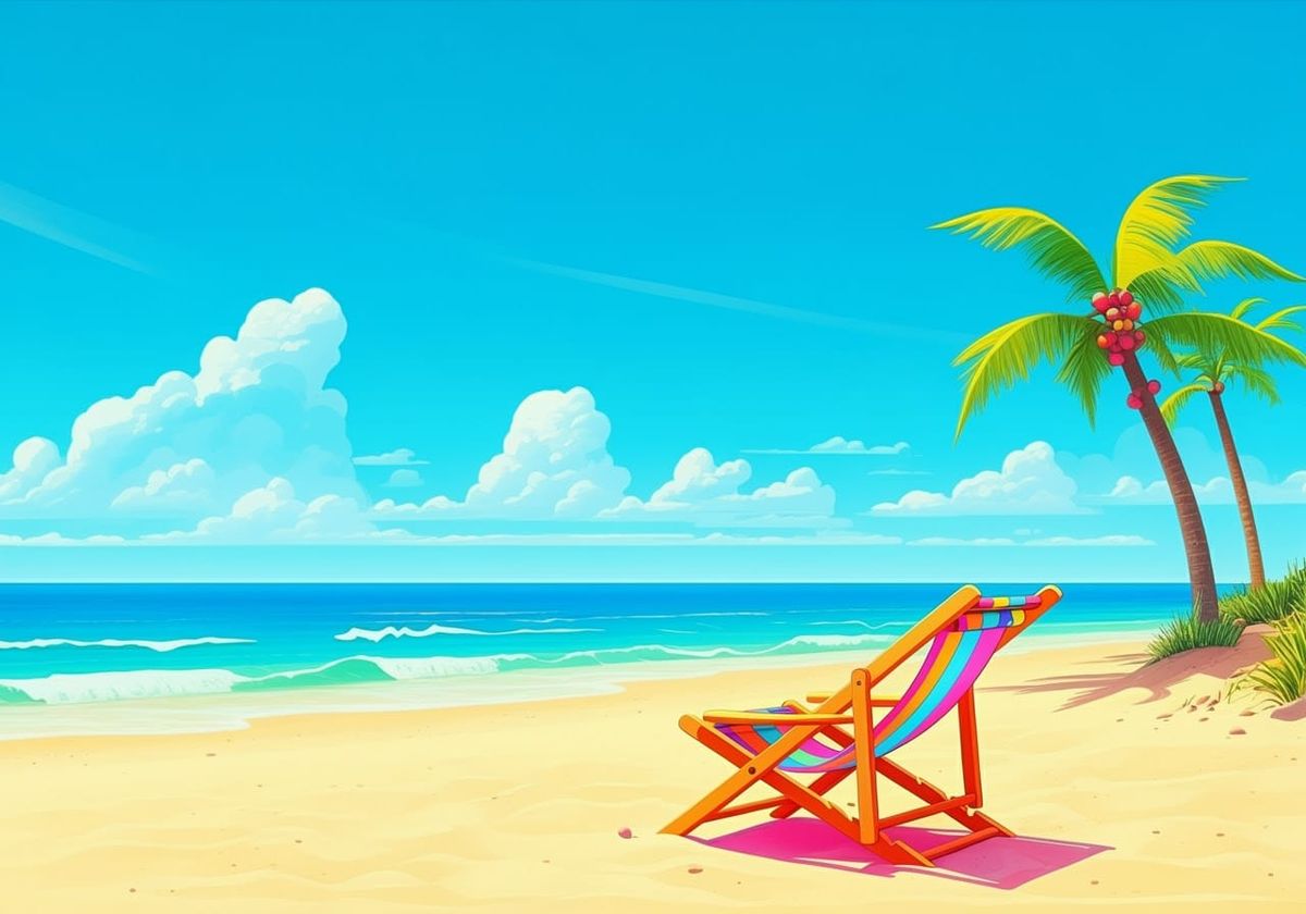 This image shows a vibrant, sun-drenched beach scene featuring a colorful lounge chair and palm trees. The art style evokes playful, futuristic elements in a bright and cheerful atmosphere.