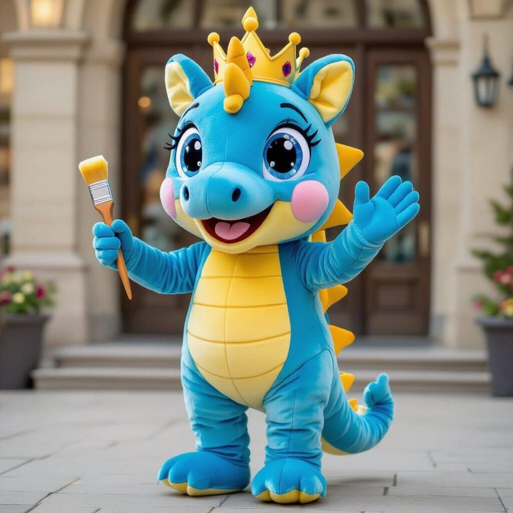 This image features Tavrik the Seahorse as a friendly mascot costume. The design resembles a plush fursuit with a large seahorse head, yellow paintbrush, and blue bodysuit, accented by a red scarf.