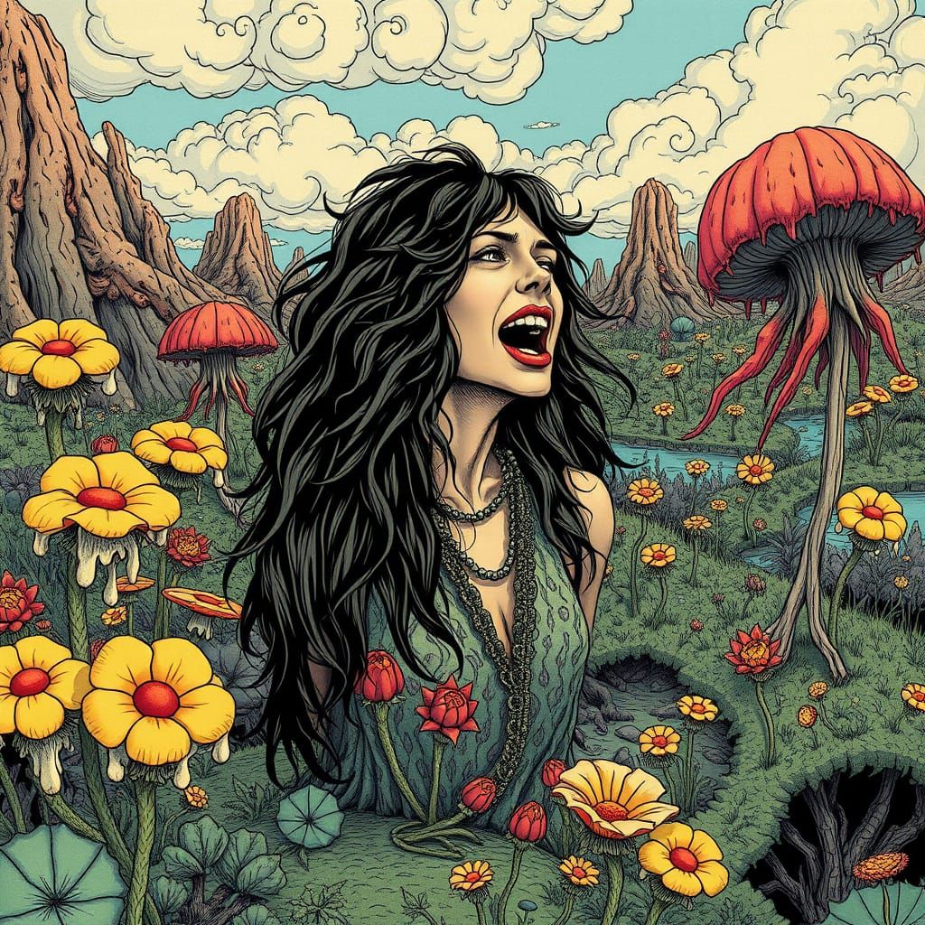 This surreal painting depicts Janis Joplin amidst a vibrant, otherworldly landscape of melting flowers and strange, alien plants, reminiscent of 16th-century Flemish art and Druillet's intricate illustrations.