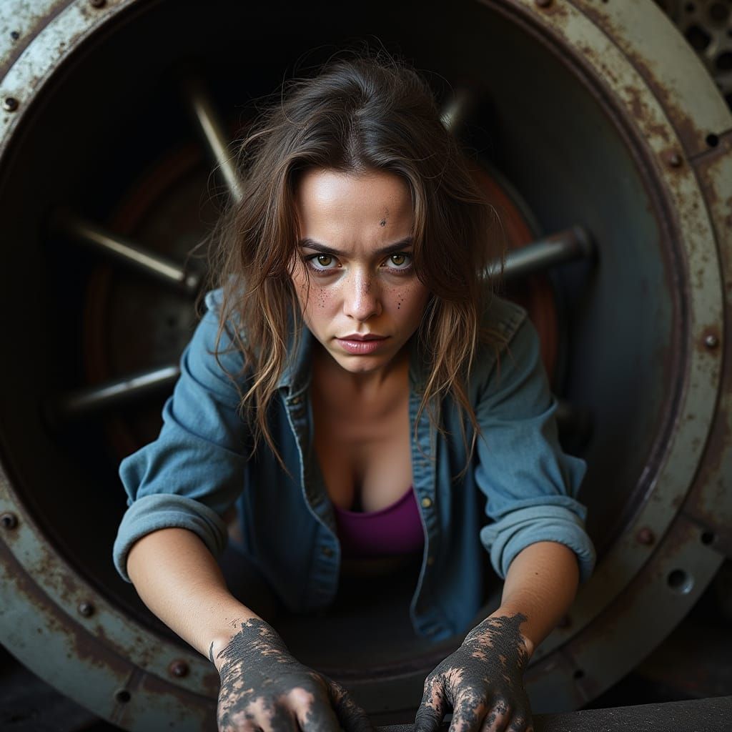A woman, set against a backdrop of industrial machinery, exudes determination as she works to repair the complex machine, her hands and face smeared with grease, amidst a moody and atmospheric setting reminiscent of documentary photography and industrial landscapes.