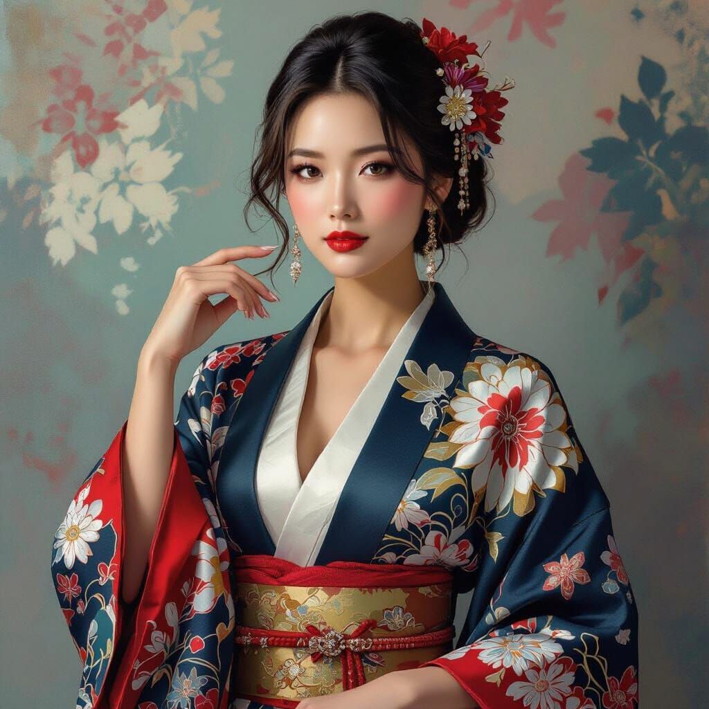 A digital painting of a woman in elegant attire, posed in a sophisticated setting. This vibrant image blends digital and traditional mediums, with an expressive, colorful aesthetic.
