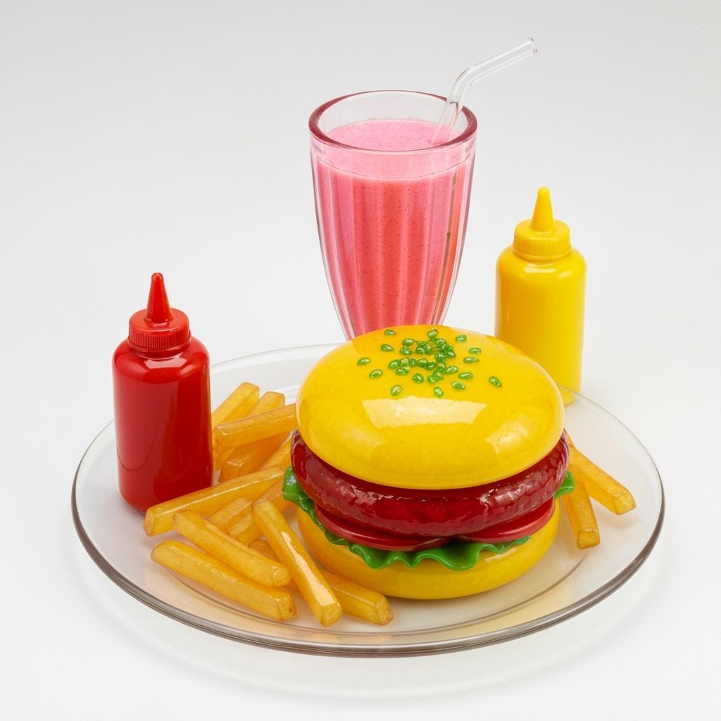 This image shows a colorful glass sculpture of a fast food meal. The meal includes a hamburger, french fries, milkshake, and condiments, all crafted from vibrant colored glass.