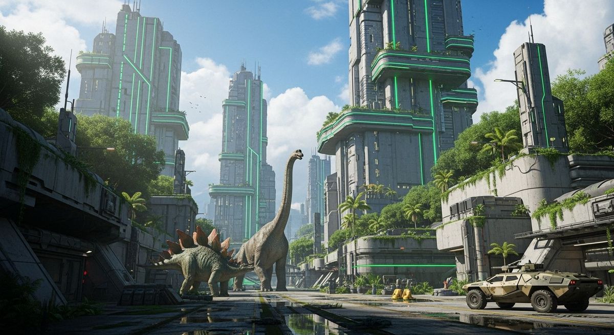 This digital matte painting depicts a vast futuristic industrial zone with brutalist bunkers and skyscrapers featuring green neon lights. Dinosaurs and a sleek vehicle are present in this vibrant, jungle-integrated landscape.