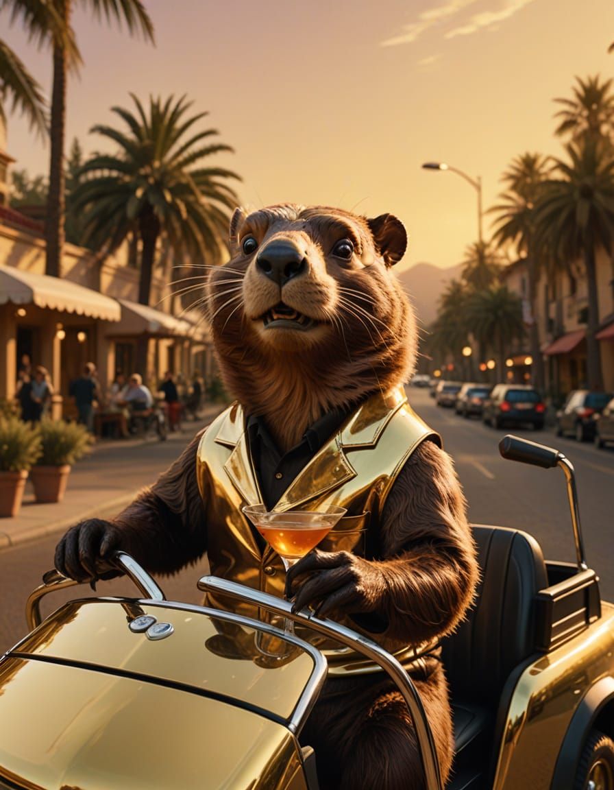 This vibrant image captures Bruno Beavraluzzio, an andromorphic beaver, driving a gleaming gold golf cart amidst a bright, gradient sunset background. The cinematic film still features smooth, suave, and detailed textures, with intense color grading and expert lighting, evoking a hyper-realistic concept ...