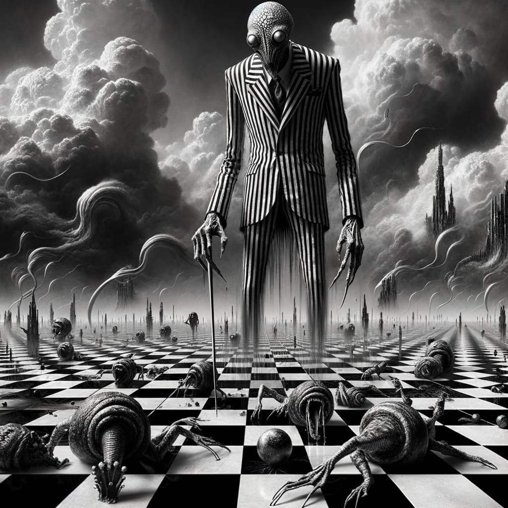 A surreal black-and-white scene features a colossal frog in a pinstripe suit, its form distorted by a vortex. Broken chess pieces litter an endless checkerboard landscape as tendrils connect it to the ground.