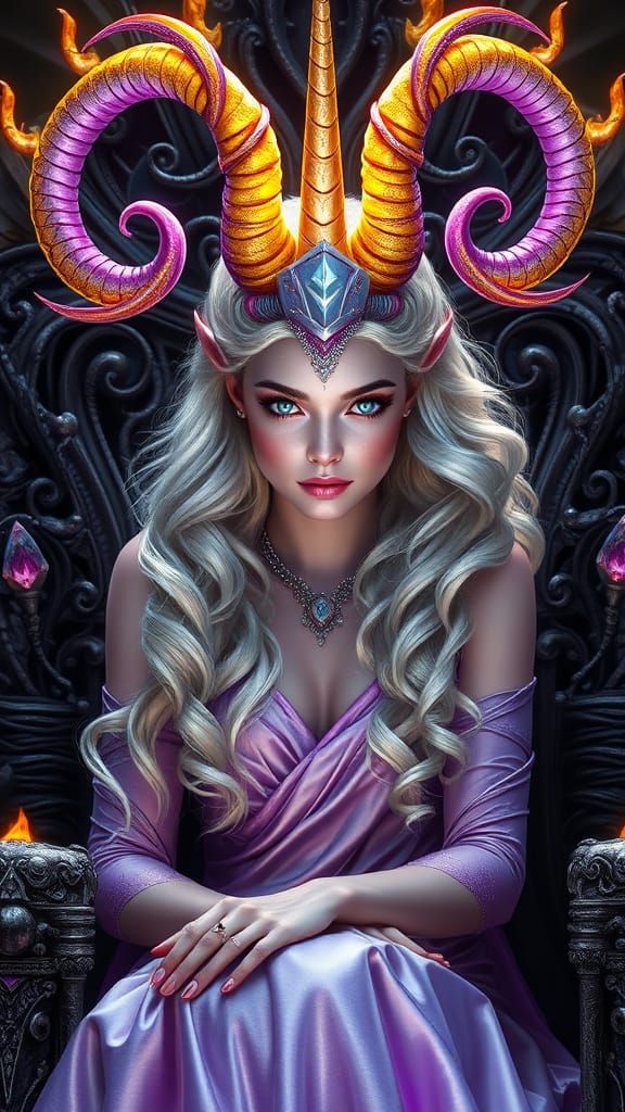 A majestic elven queen with unicorn horns sits on a vine throne. The fantasy art features shimmering silk, turquoise eyes, and vibrant purple and yellow colors with volumetric lighting.