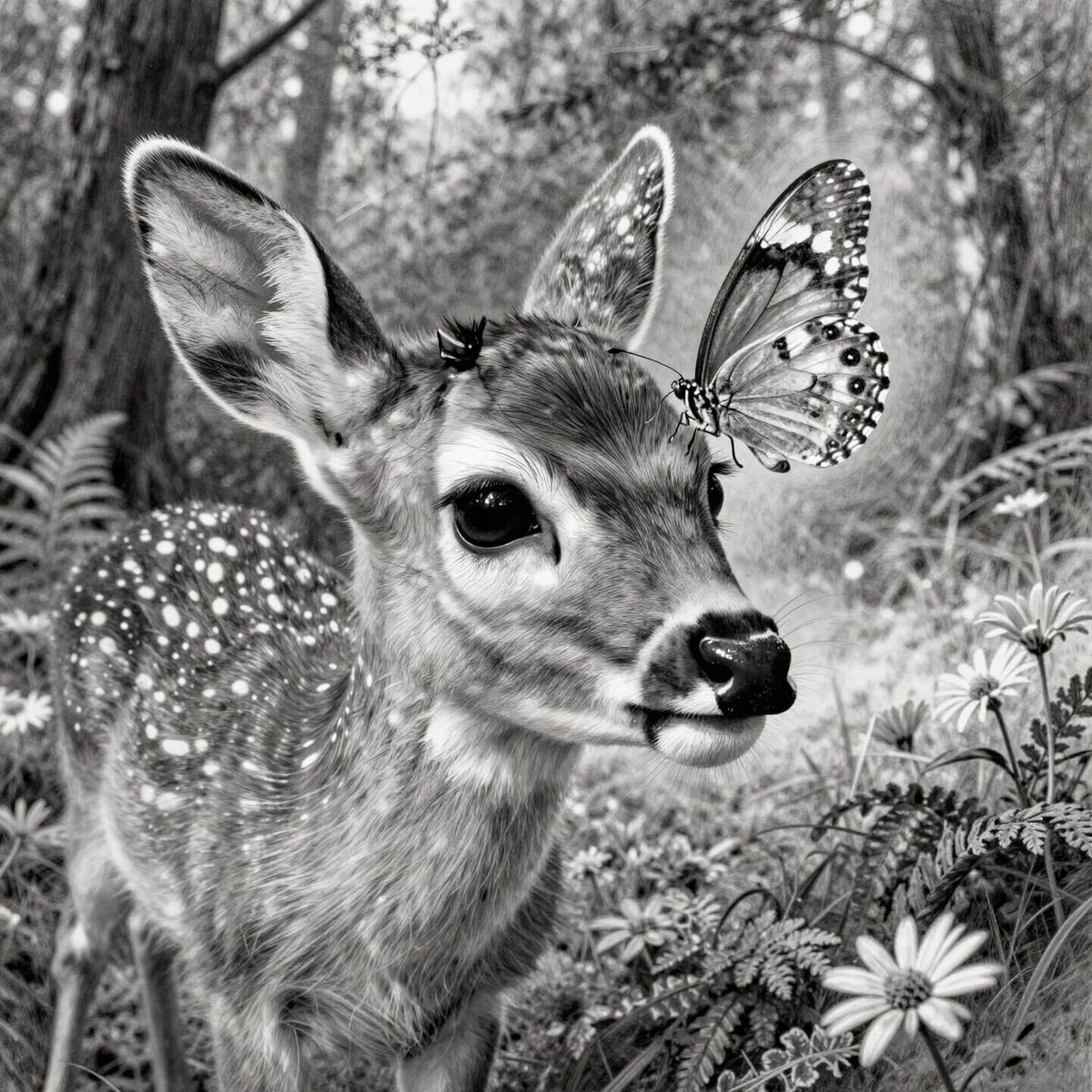 A highly detailed graphite pencil drawing of a fawn with a butterfly on its nose, captured in a magical close-up. The fawn's wide, crossed eyes show innocent surprise and wonder.