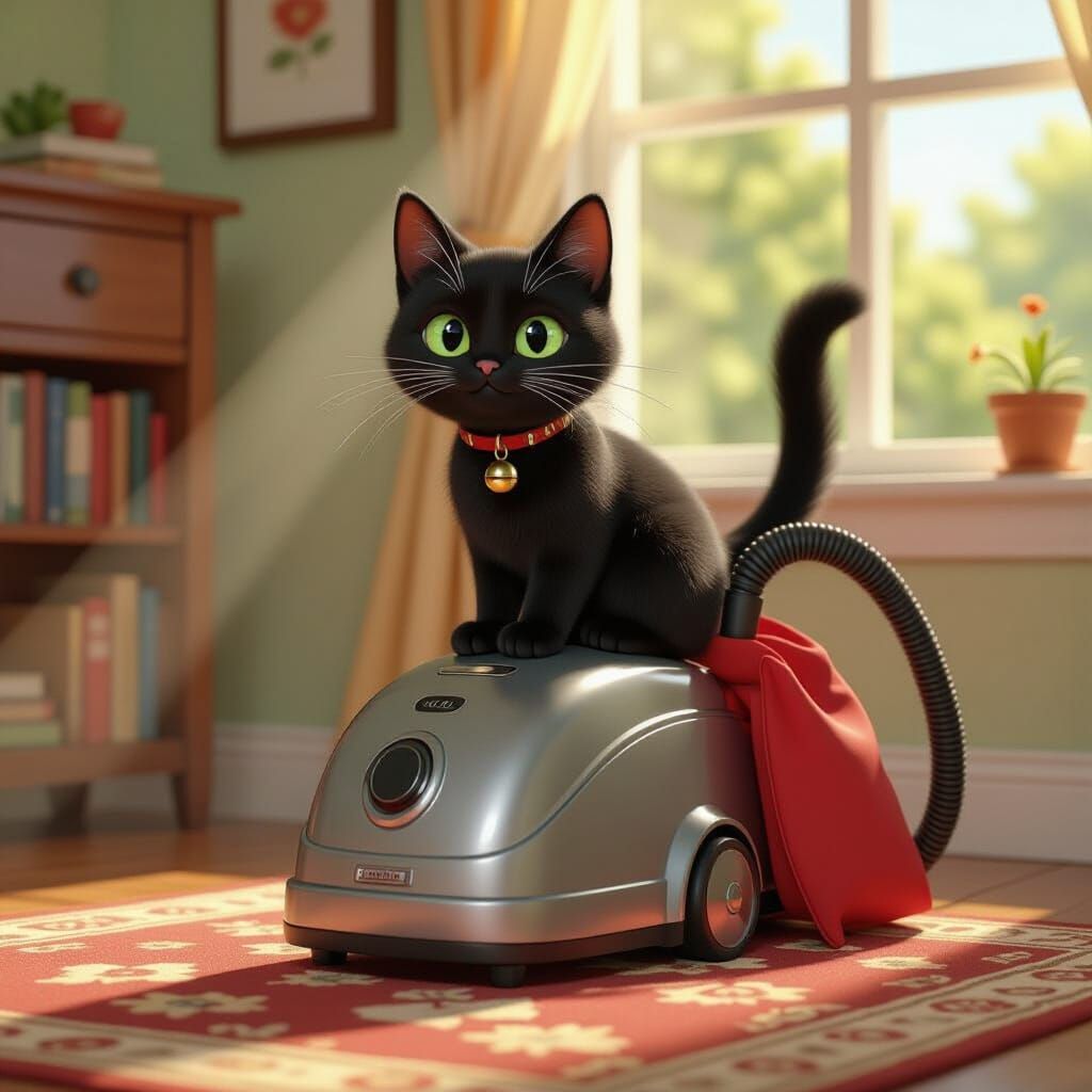 A black cat with green eyes sits on a vintage silver vacuum cleaner with a red bag. The scene is set in a warm, inviting living room with a sunbeam.