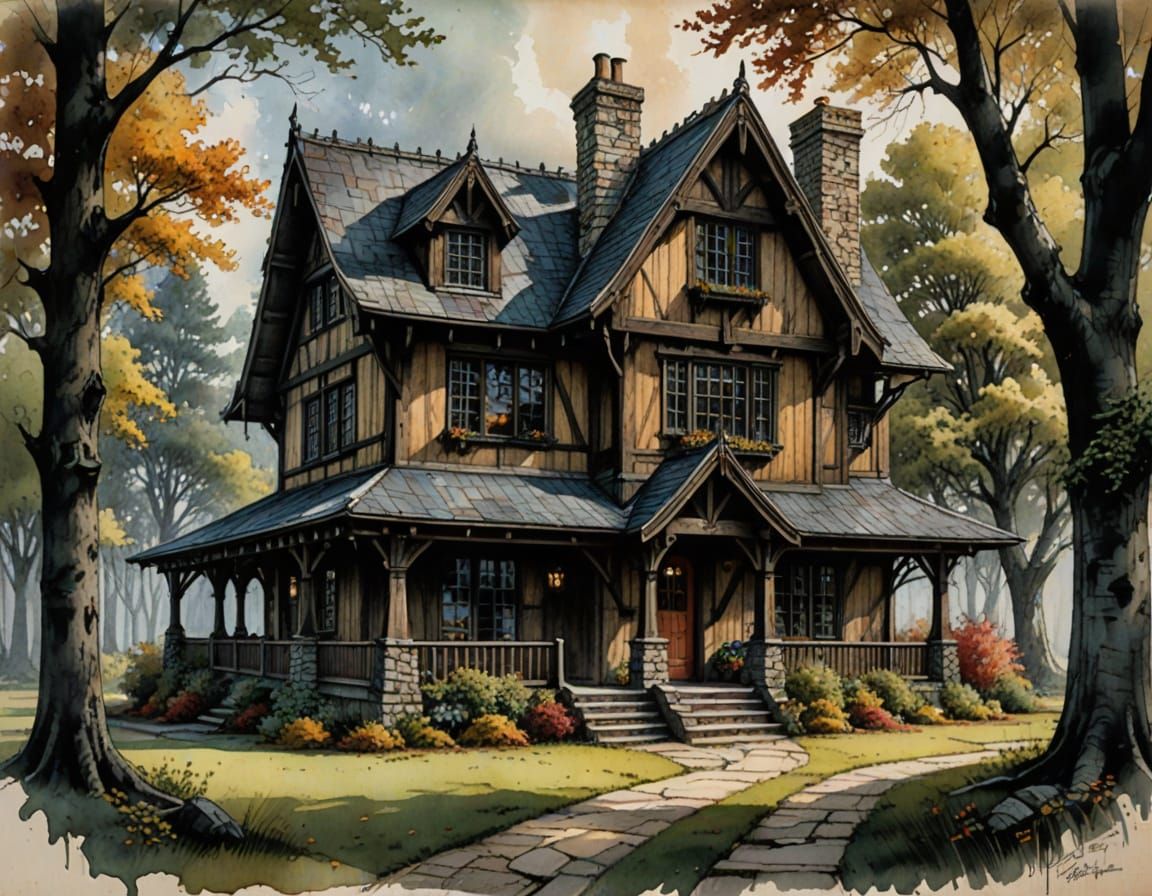 A detailed sketch of a Tudor-style cottage nestled among oak trees. Created with bold outlines and soft watercolor washes on parchment, the image features intricate details and vivid, harmonious colors.