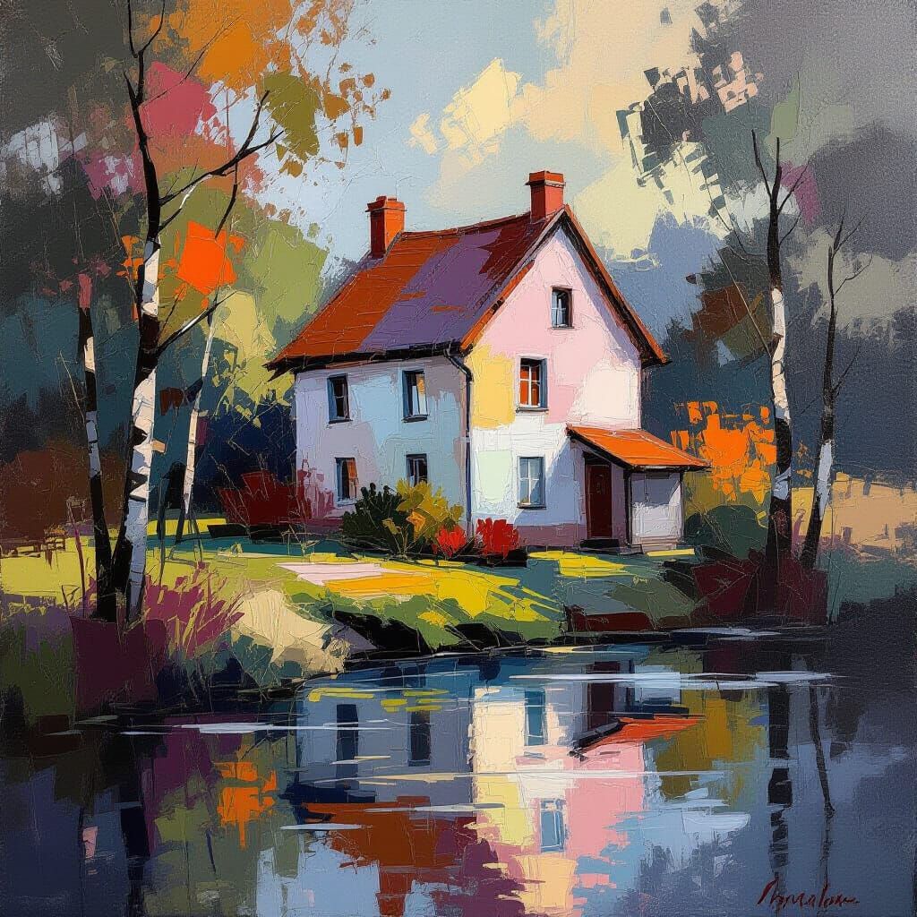 This image shows a house by the riverside with abstract details. The creative piece features a blend of pastel, warm, and dark colors, creating a dramatic effect.