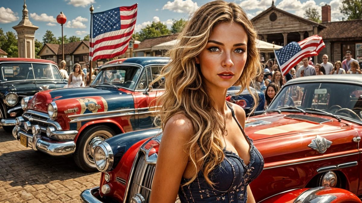 This image is a nostalgic depiction of beautiful women surrounded by vintage American cars, set against a backdrop of an American flag, evoking a funky seventies aesthetic with a touch of untamed beauty