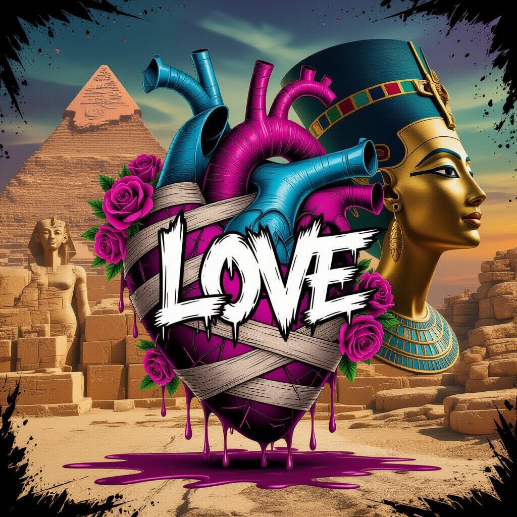 This image showcases a spectral heart entwined with ghostly roses, set against an ancient Egyptian backdrop with Nefertiti's profile. Features graffiti-style 'Love' and dynamic street art textures.