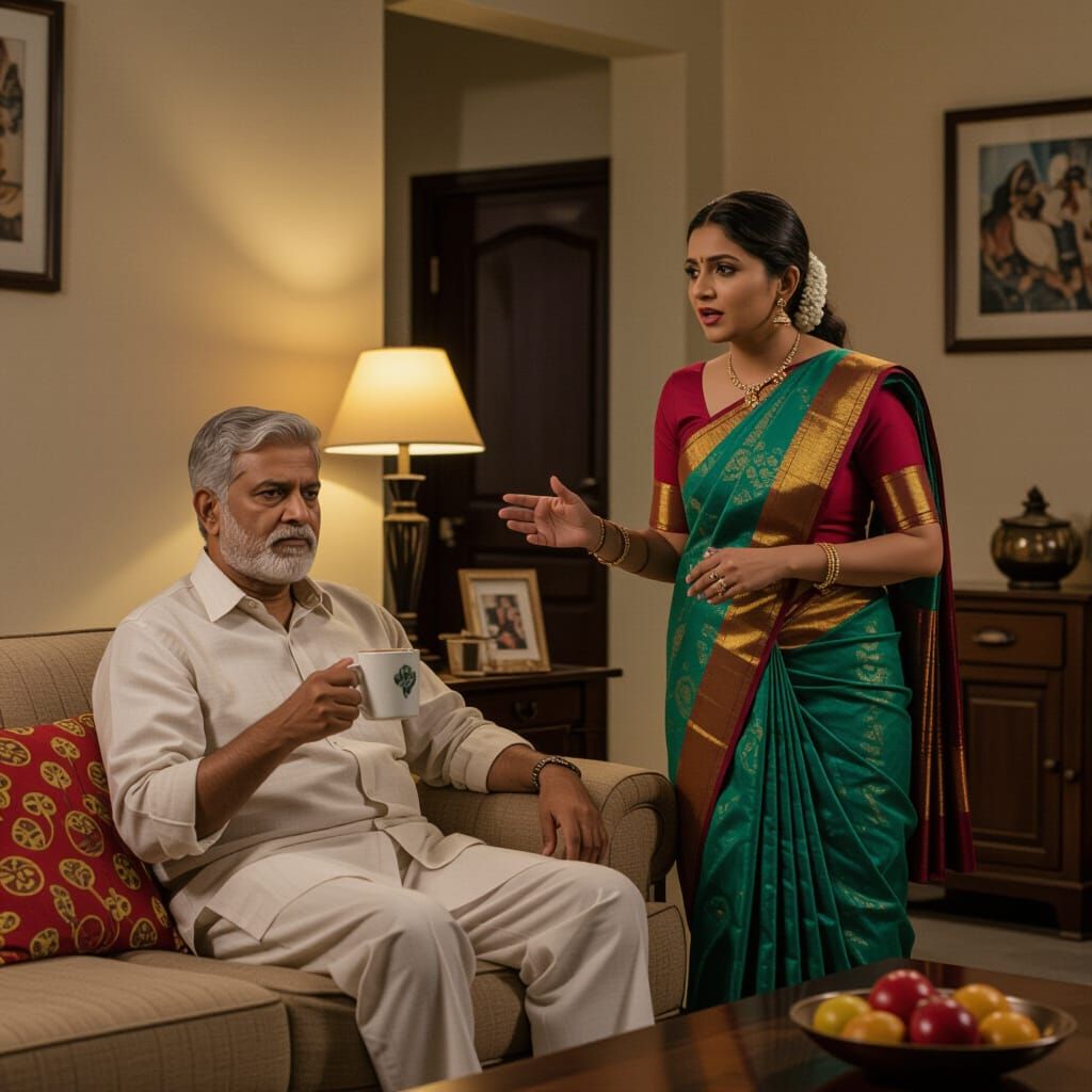 This image depicts a warm South Indian home interior. A thoughtful husband holds a coffee mug on the sofa while his wife stands nearby, speaking animatedly, capturing marital dynamics.
