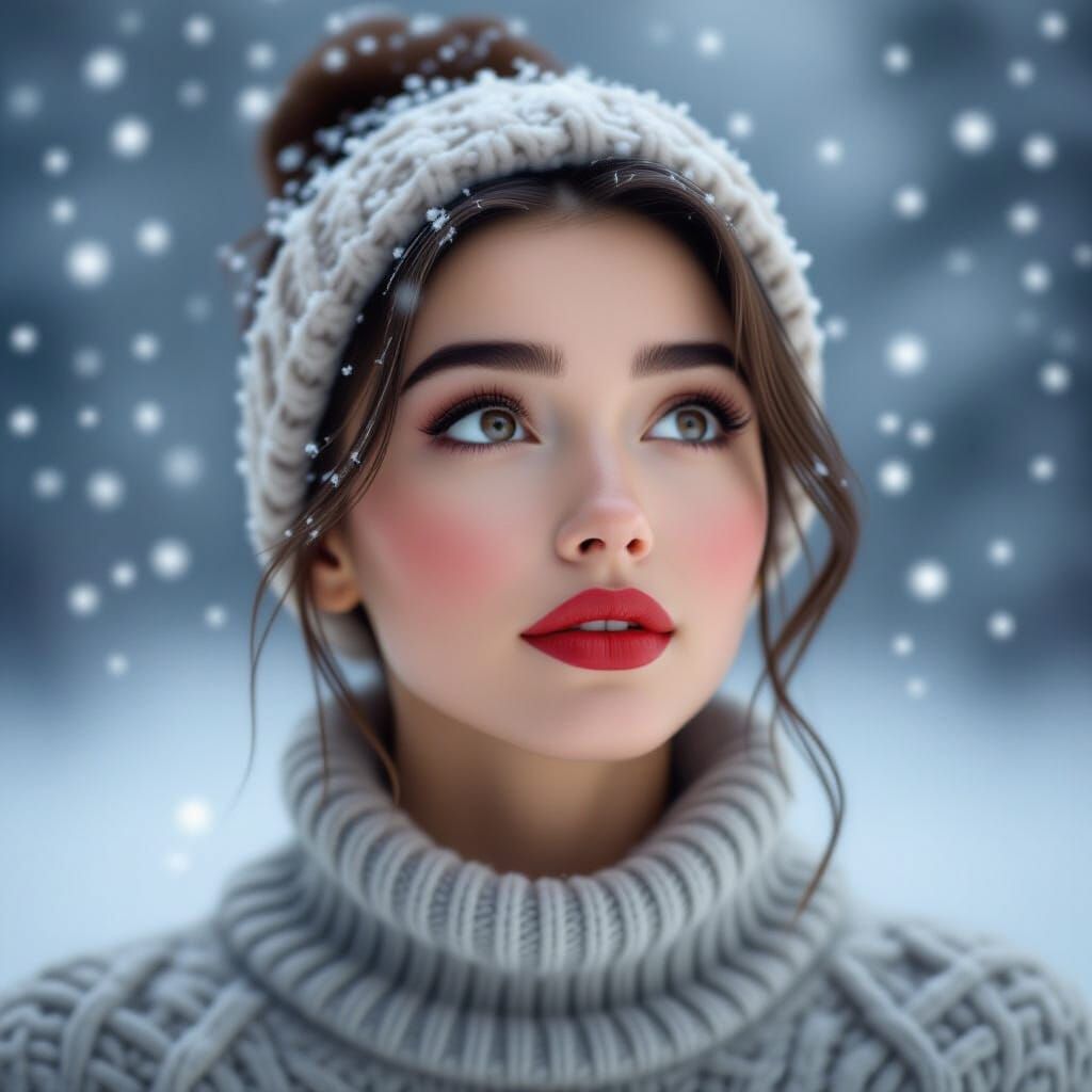 This image shows a detailed, photorealistic portrait of a young woman with expressive eyes and plump lips, looking at falling snow. Features cinematic lighting and a shallow depth of field.