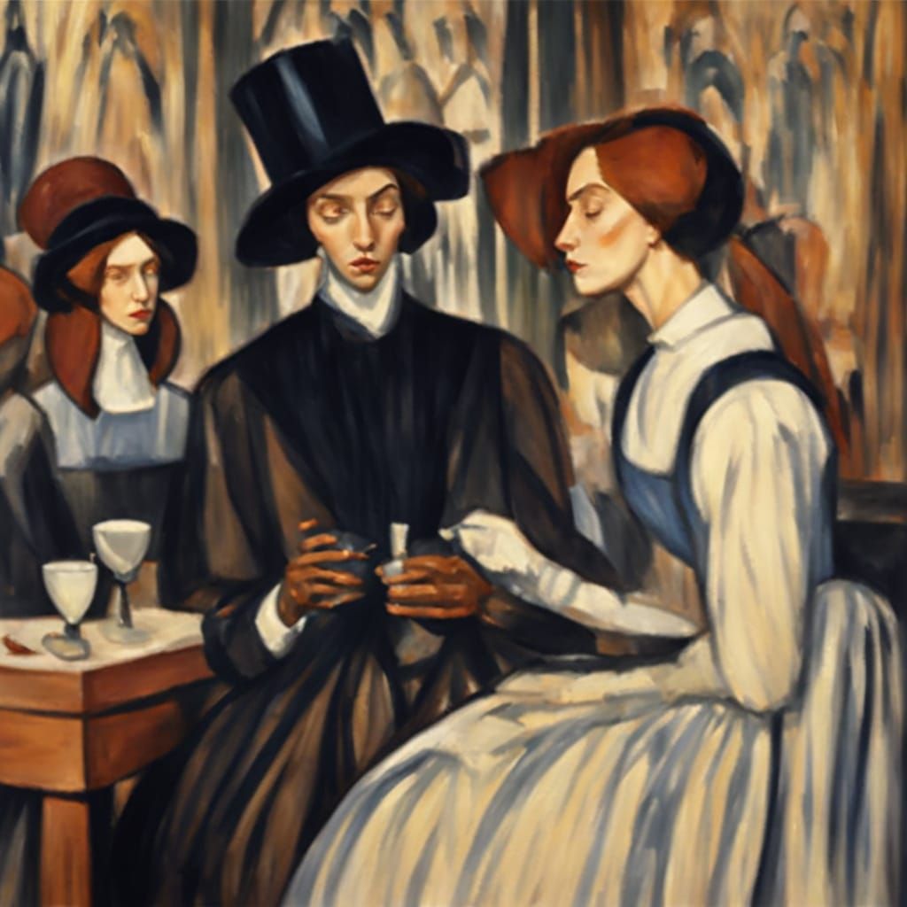 This image depicts a comical scene of a foolish vampire attempting to feed on inanimate mannequins, rendered in a style reminiscent of Zinaida Serebriakova and Amedeo Modigliani.