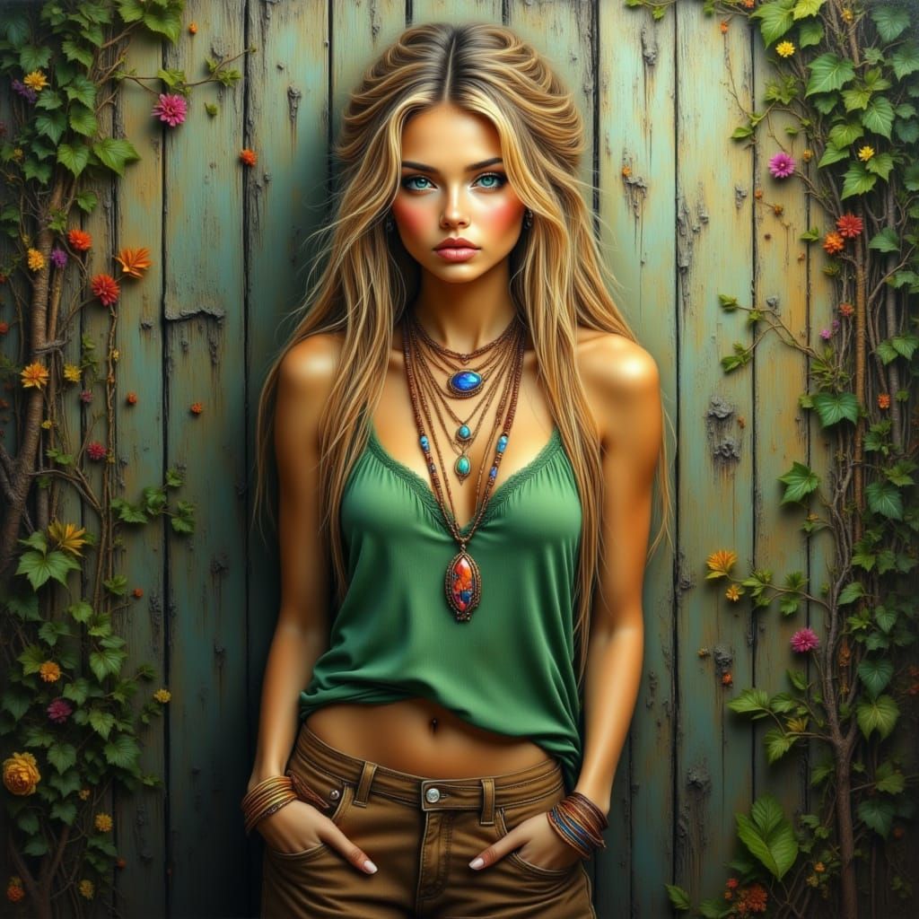 This image shows a young woman in earthy, flowing clothes with layered jewelry, set against a richly textured forest background. It's a digital oil painting with visible brushstrokes, creating a dreamy, artistic mood.