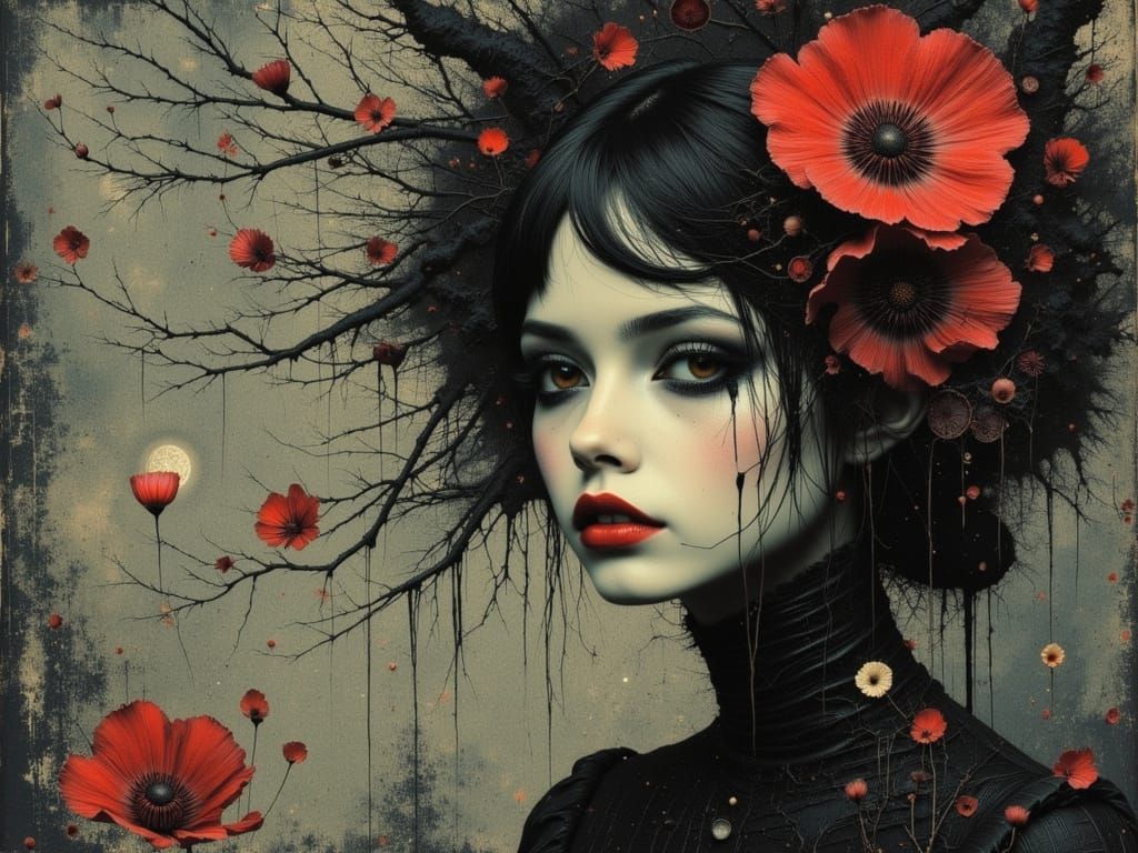This image features a beautiful, ethereal young Gothic woman bathed in moonlight. The artwork combines elements of Dark Romanticism and Renaissance aesthetics with a sepia and ink-dripped blossom style.