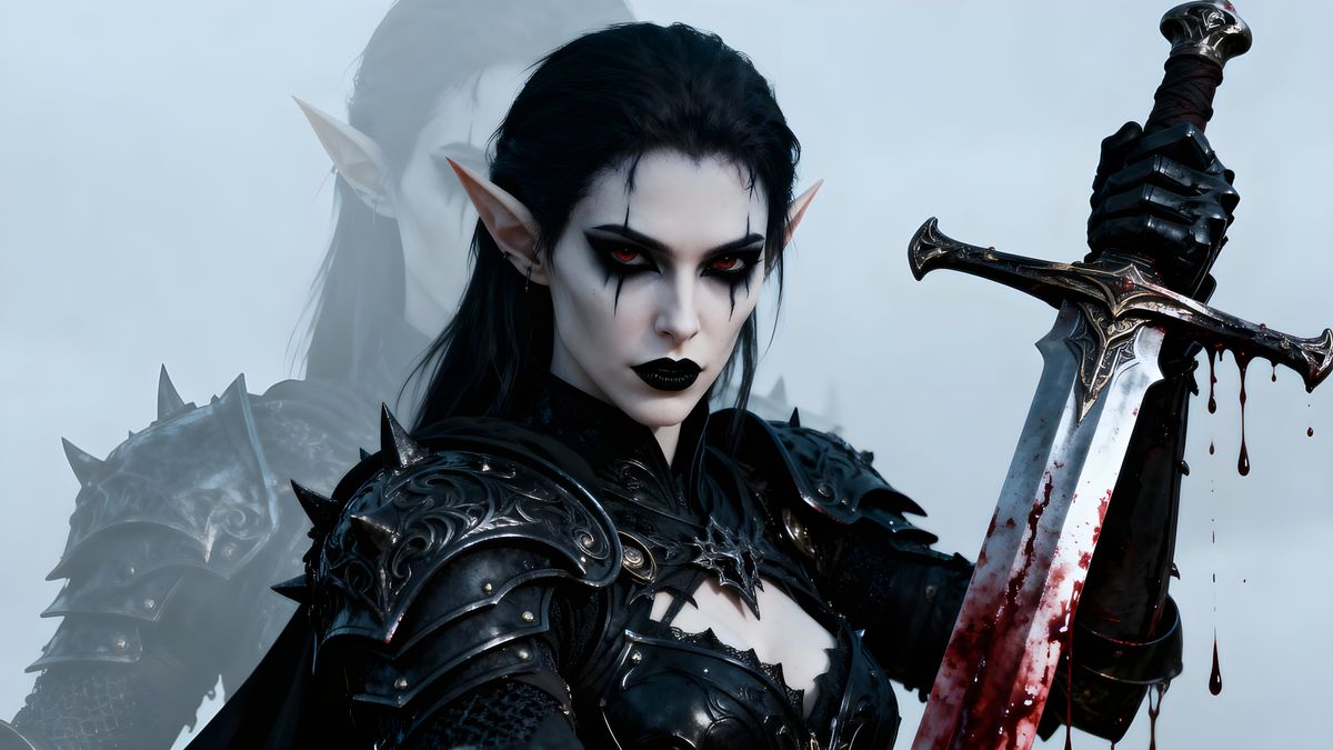 This image features a highly detailed, photorealistic gothic warrior with white skin, black makeup, armor, and a sword dripping with blood. Rendered with cinematic atmosphere and sharp focus.