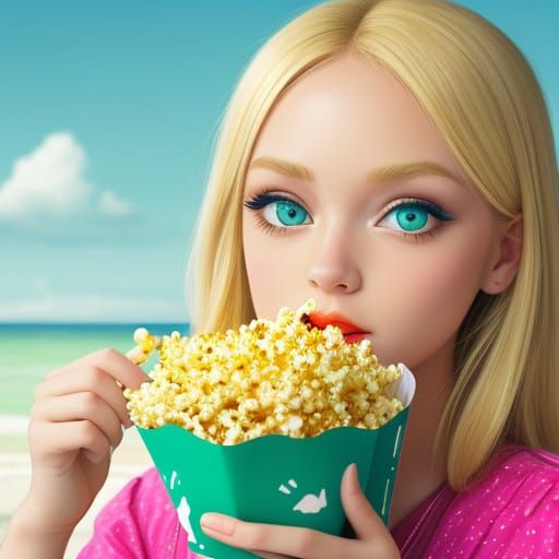 This image features a young blonde girl with large green eyes, wearing makeup and enjoying a large bowl of colorful popcorn by the ocean.