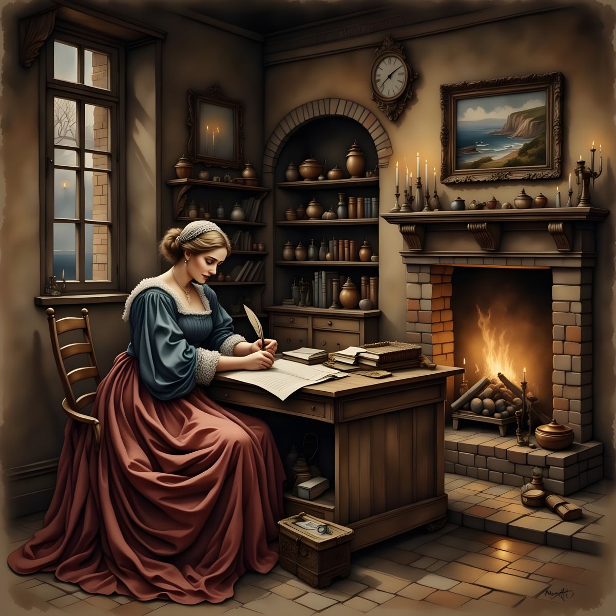 This image depicts a 16th-century woman writing by candlelight, reminiscent of Spanish Renaissance art. The scene features rich textures and dramatic lighting, evoking quiet contemplation.