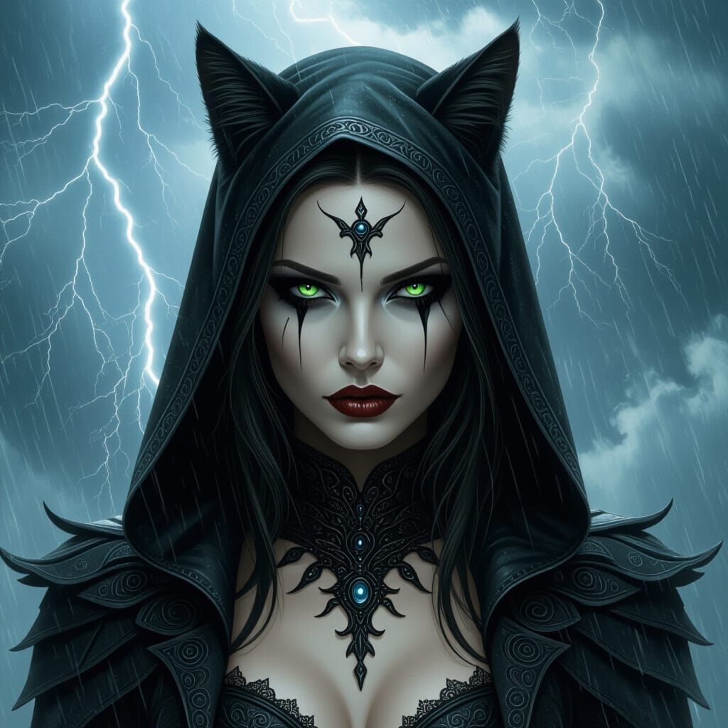 This image shows a gothic, super-beautiful alien woman in the darkness of the underworld. She has a cat face and is a double evil scary warrior with a horse in a horror aesthetic.