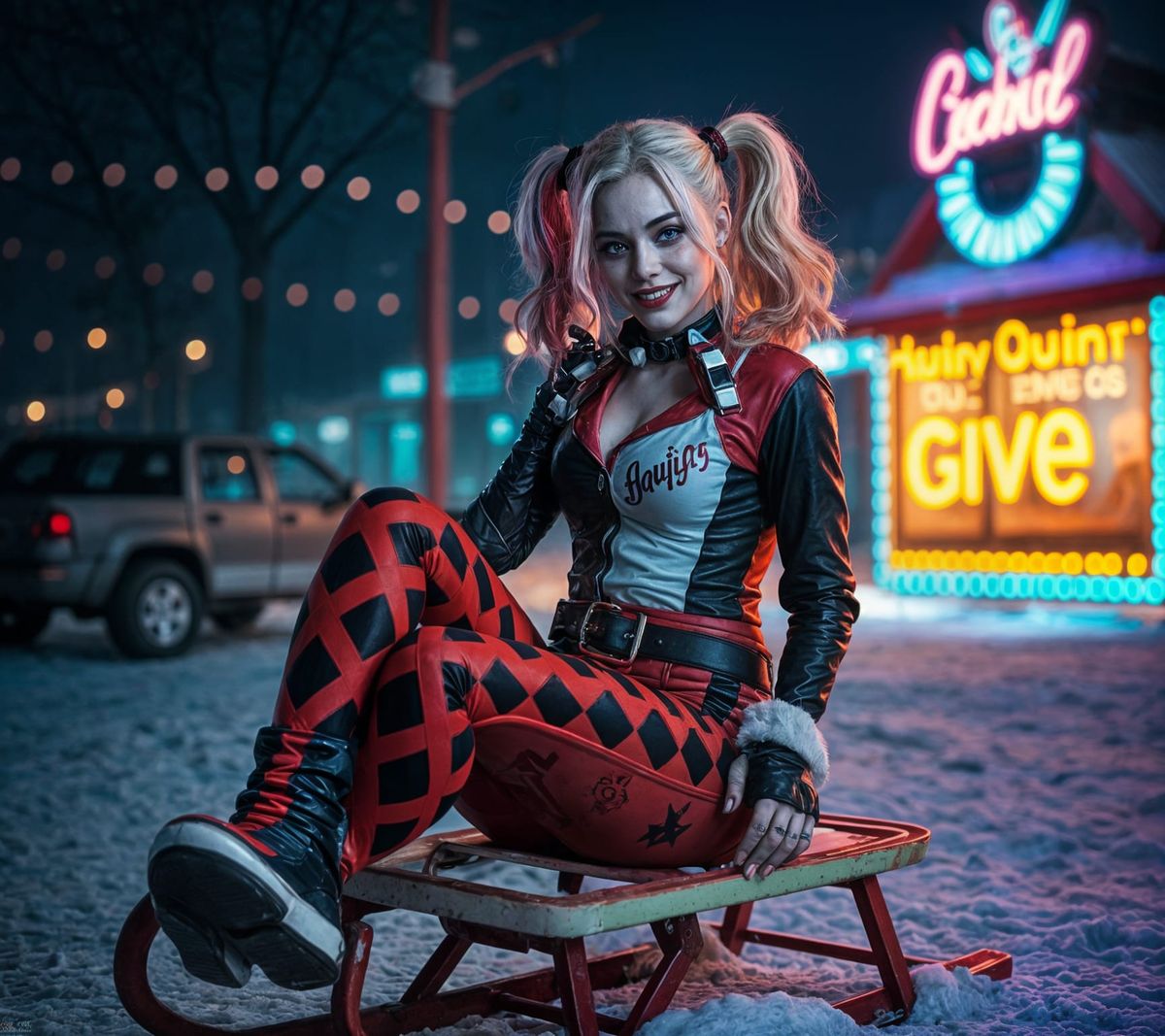 This hyperrealistic image shows Harley Quinn sitting on a small sled, illuminated by vibrant neon colors, evoking a playful and mischievous mood.